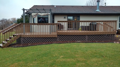 It was out with the old and in with the new for this homeowner. The homeowners wanted an open space that would flow nicely, providing multiple areas for entertaining. They desired a backyard retreat that was spacious enough for a comfortable, yet cozy setting. The brick work was completed using Belgard products. The patio includes Lafitt Danville Beige pavers, with an Ashbury Haze soldier course. The seat walls, pillars, and fire pit were created using the Weston 3 piece retaining wall blocks in Danville Beige with an Ashbury Haze accent. The pergola added the rustic feel, with the help of dark brown cedar timbers. No paver fortress like this would be complete without lighting to add the perfect ambiance once the sun sets. Integral lights were installed throughout the seat walls and step leading up to the house to illuminate the space at night.